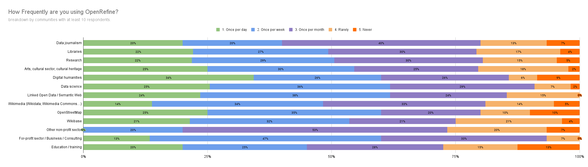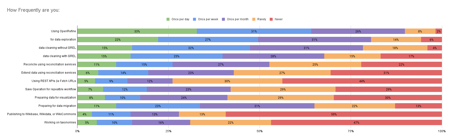 The survey also confirmed anecdotal feedback: while OpenRefine is important for Wikimedians, they use it less frequently compared to other communities. Only 14% reported using it daily, compared to 33% of our total user base.